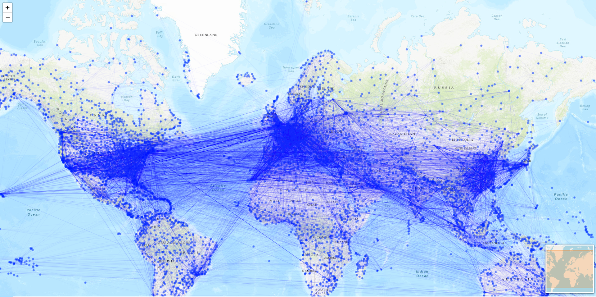 La RVI está formada por todos los aeropuertos internacionales del mundo unidos mediante aristas ponderadas por el número de vuelos que los conectan. Su configuración puede observarse en la siguiente imagen: