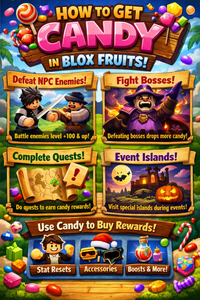 You can get Candy in Blox Fruits by completing Halloween event quests, defeating event enemies, and exchanging special items with the Halloween NPC. Candy is a limited-time event currency and cannot be obtained outside of events.