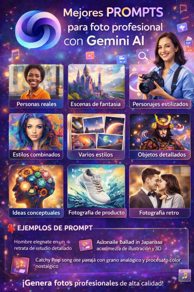 ¿Quieres crear una imagen con apariencia profesional usando inteligencia artificial? Con los Gemini AIprompts para foto profesional con , puedes lograr retratos, productos y escenas de calidad editorial sin necesidad de cámara. Este artículo te enseña cómo estructurar tus comandos (prompts) para obtener resultados impresionantes en Gemini, una de las plataformas de generación de imágenes más avanzadas de 2025.